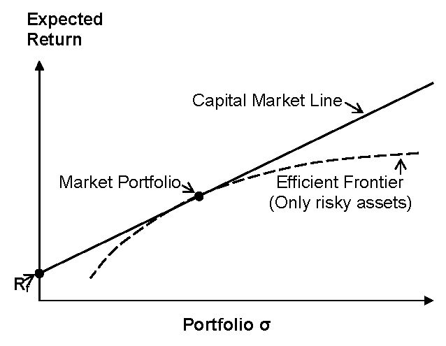 以上黄线上的点所代表的最优选择是基于我们只考虑全部投资在有风险的投资产品的情况下,如果我们此时加入无风险投资(risk free investment),那么情况就不一样了。在这里我们引入另外一个概念叫做 Capital Market Line,它的作用在于求出了市场风险投资和无风险投资的最优组合。