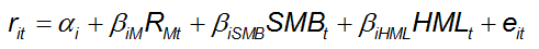 在Fama French这个公式中,SMB为市值(size)因子收益指数(Small comp return minus Big comp return),HMI为账面市值比(book-to-market)因子收益指数(High btm return minus Low btm return)。