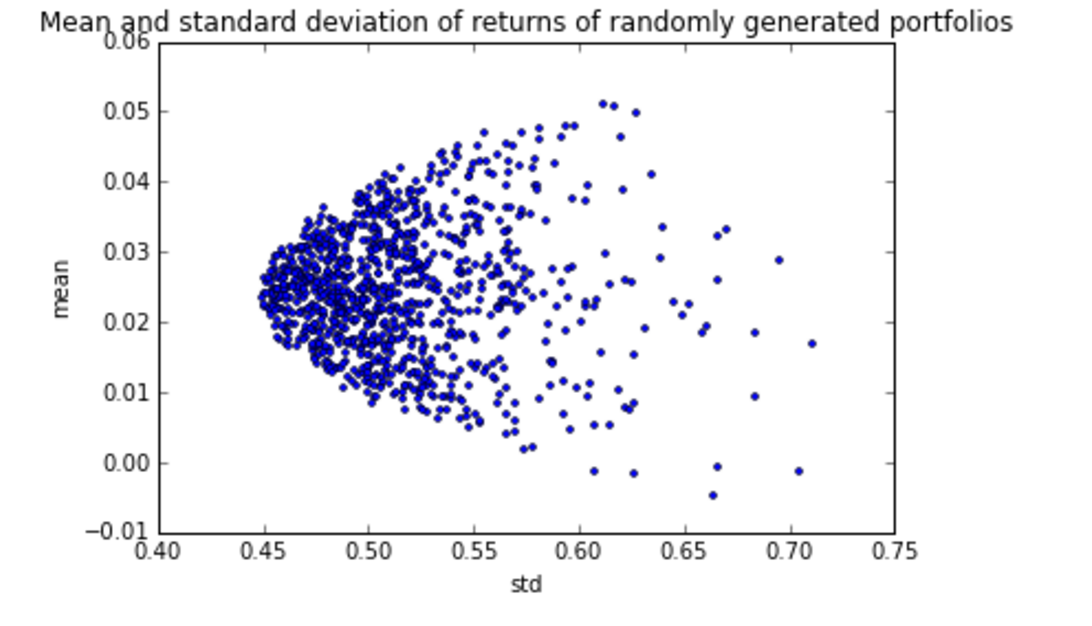 自由市场中有各种各样的投资标的,我们建立几个随机的风险投资,随机生成它们的收益。然后再随机产生权重(权重总和为1),可以获得如下图所示的蓝点,每一个蓝点代表一个由这几个风险资产构成的组合的收益和方差,横轴为方差(风险),纵轴为均值(收益)