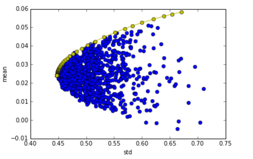 获取了风险投资组合分布图之后,我们可以进一步画出efficient frontier,在黄线上的每个投资组合,都是在该收益情况下的最低风险的最优选择。具体求解过程可以参考Markowitz 资产组合优化在ipython中的实现