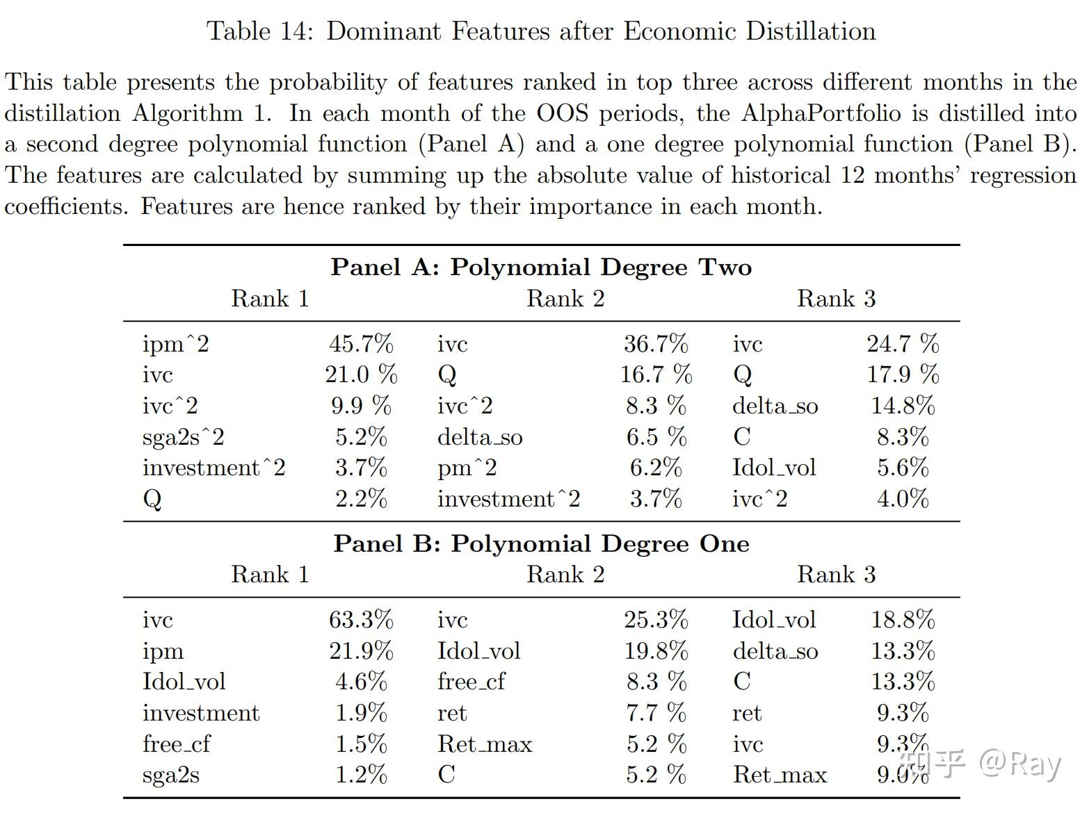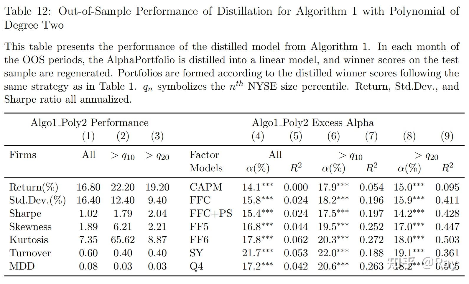 然后我们生成具有最重要特征的多项式的项。对于OOS时期的每个月,我们可以通过使用Lasso将赢家的分数与选定的项进行回归来提炼AP模型。表12中的结果显示,即使是提炼出来的线性模型在OOS测试中也取得了显著的性能。这里poly = 1基本上是一个线性回归。人们可以在蒸馏练习中包括更高等级的多项式项,为了简洁起见,我们停止在2度(2阶)。请注意,提炼利用了训练有素的AlphaPortfolio模型的知识,并在原始模型中表现不佳。因此,我们不应该或不可能有效地使用提炼出来的模型,来代替AlphaPortfolio进行交易。