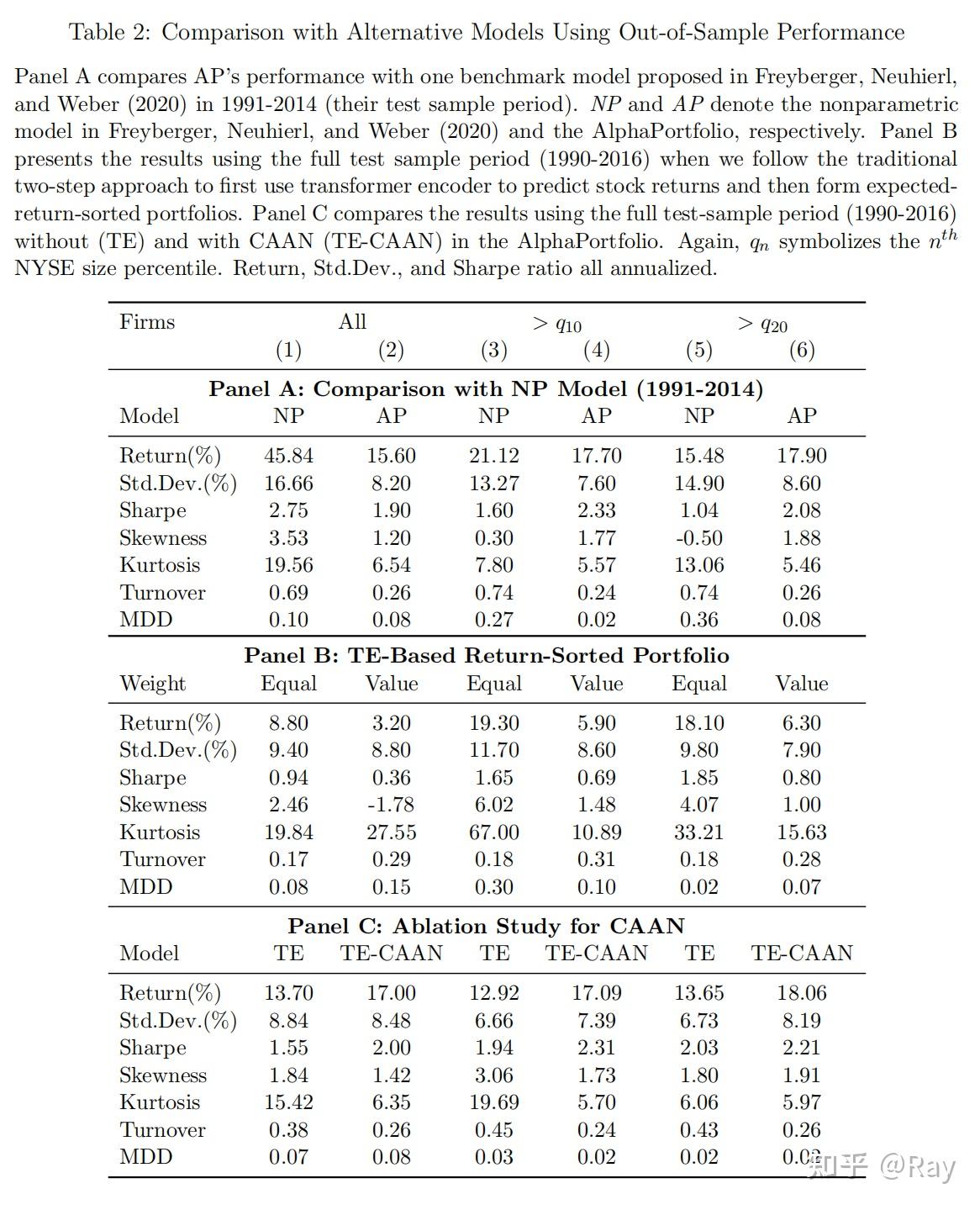 最后,表2中的C组显示了我们对CAAN的创新是如何进一步促进AP性能的。仅仅使用TE,RL仍然取得了比其他ML模型(在小组A中通常表现不如NP开始)和两步法(如小组B所示)更高的OOS回报和夏普比率,以及更低的换手率和最大回撤。然而,CAAN在RL的基础上大大改善了OOS的表现,在三个测试样本中平均增加了0.33的夏普比率和近4%的年化收益,同时降低了40%的换手率。虽然这里没有报告,但当我们使用LSTM实现AP时,CAAN对性能的影响甚至更大(附录C2)。