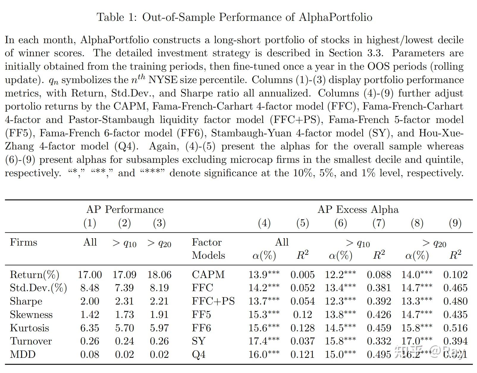我们基于深度强化学习的 "直接构建 "(投资组合)极大地改善了样本外(out-of-sample, OOS)的投资组合表现,在施加各种经济约束后,结果依然稳健。在对美国股票的说明性研究中,我们使用了12个月历史窗口中的数百个公司特征和市场信号作为预测变量,类似于Freyberger, Neuhierl, and Weber (2020)。在基线规范中,我们专注于随后12个月的平均OOS夏普比率作为投资者的目标,并训练一个投资组合模型(此后称为 "AlphaPortfolio "或 "AP"),每月重新平衡,在全部测试样本(1990-2016年)和不包括微型股(基于市值的10%或20%)的子样本上产生的夏普比率始终高于2。在控制了各种因素(CAPM、Fama-French-Carhart因素、FamaFrench-Carhart加流动性因素、Fama-French五因素、Fama-French六因素、Stambaugh和Yuan因素、Q4因素)后,年化超额阿尔法也一直超过13.5%。AP的一般性能指标(如周转率和最大跌幅)明显优于大多数已知的异常值和机器学习策略的指标。