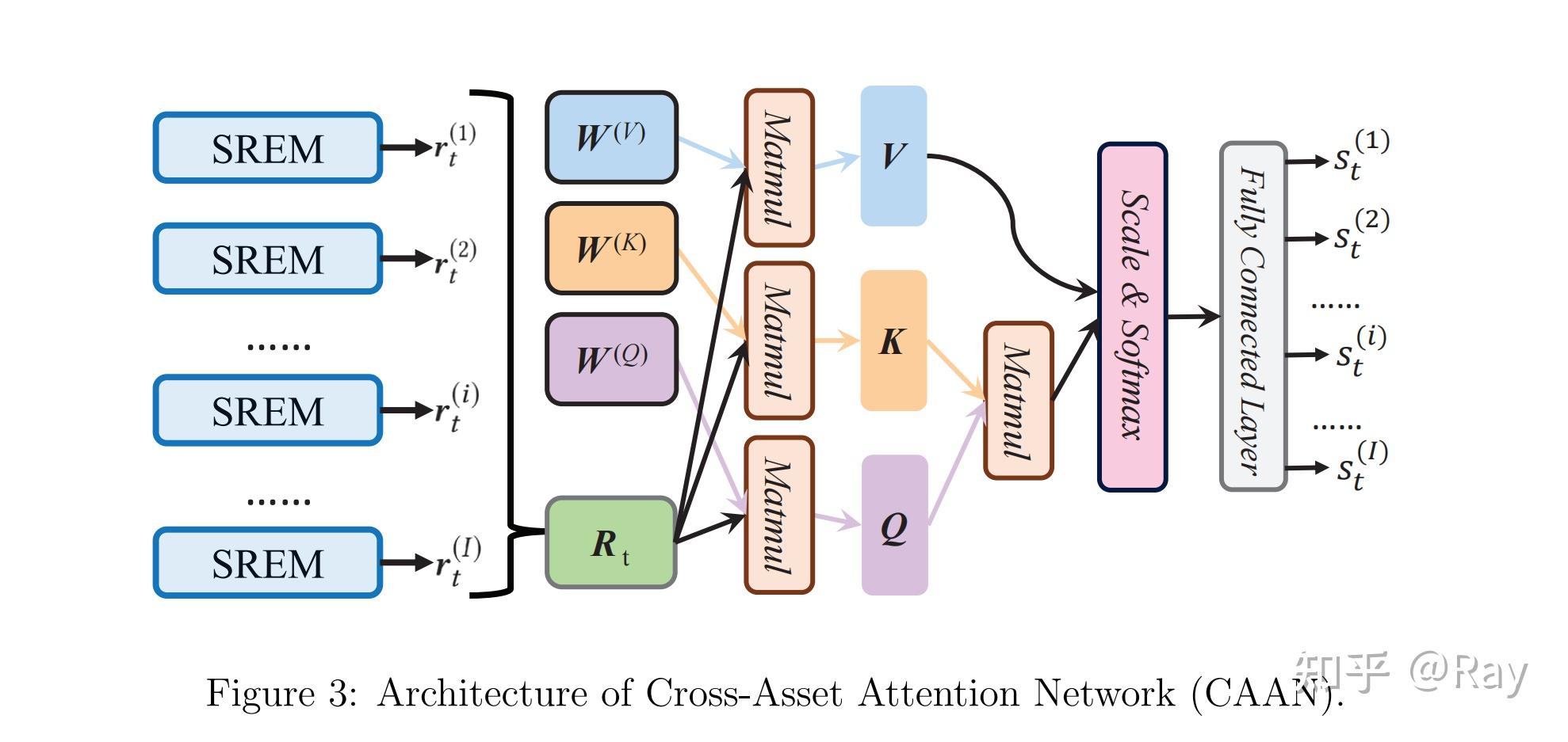 图3说明了CAAN的结构。具体来说,给定资产表征(我们省略时间t,但不失一般性),我们计算出资产i的查询向量、密钥向量和价值向量,(反正就是qkv)具体如下: