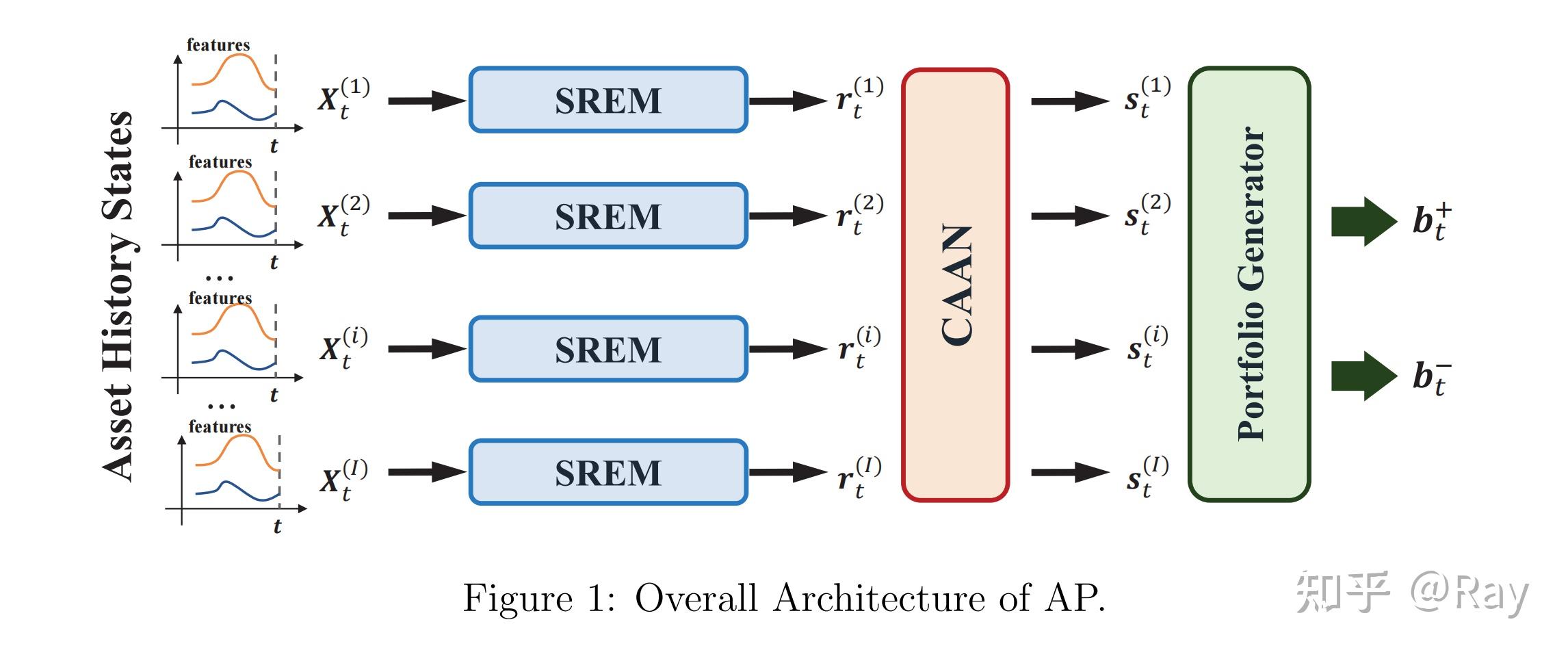 在历史时间的市场历史状态,被表达为一个张量。被指定为AP给出的组合向量,其中元素表示代理在t时刻投资于资产i的组合权重。然后,就是的回报。