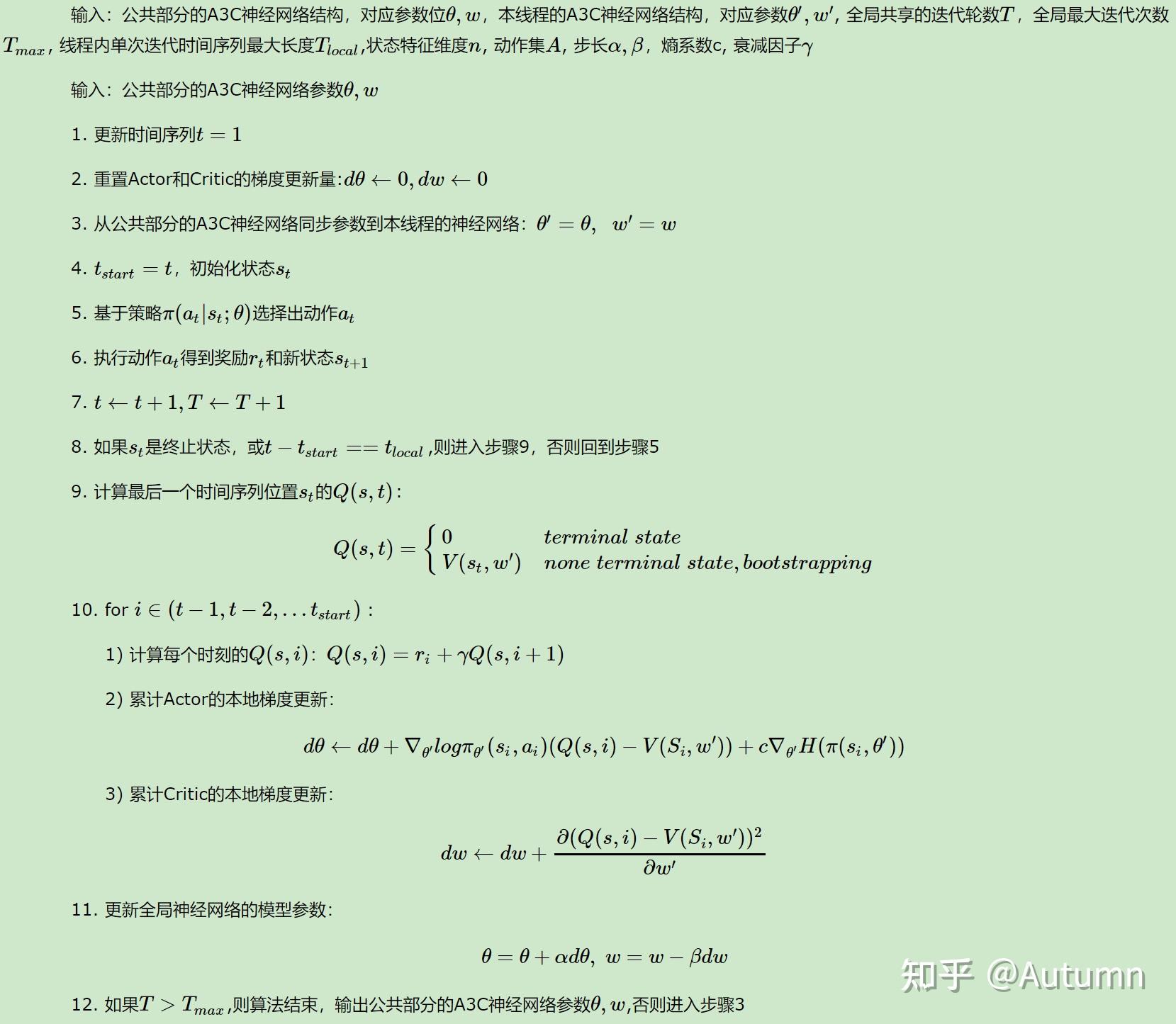 上面是A2C,在A3C中采样不是单步,而是N步。因此A3C中的优势函数表达为: