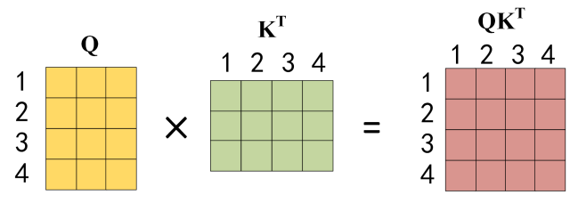 公式中计算矩阵Q和K每一行向量的内积,为了防止内积过大,因此除以 的平方根。Q乘以K的转置后,得到的矩阵行列数都为 n,n 为句子单词数,这个矩阵可以表示单词之间的 attention 强度。下图为Q乘以 ,1234 表示的是句子中的单词。