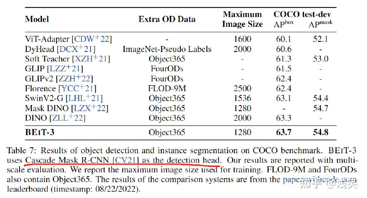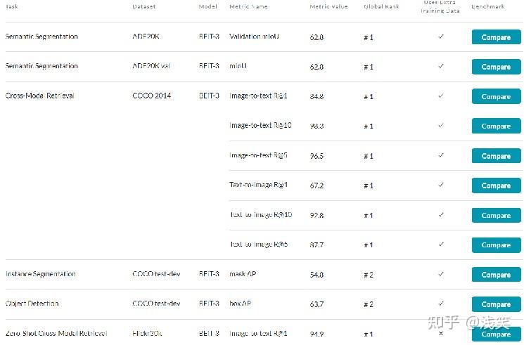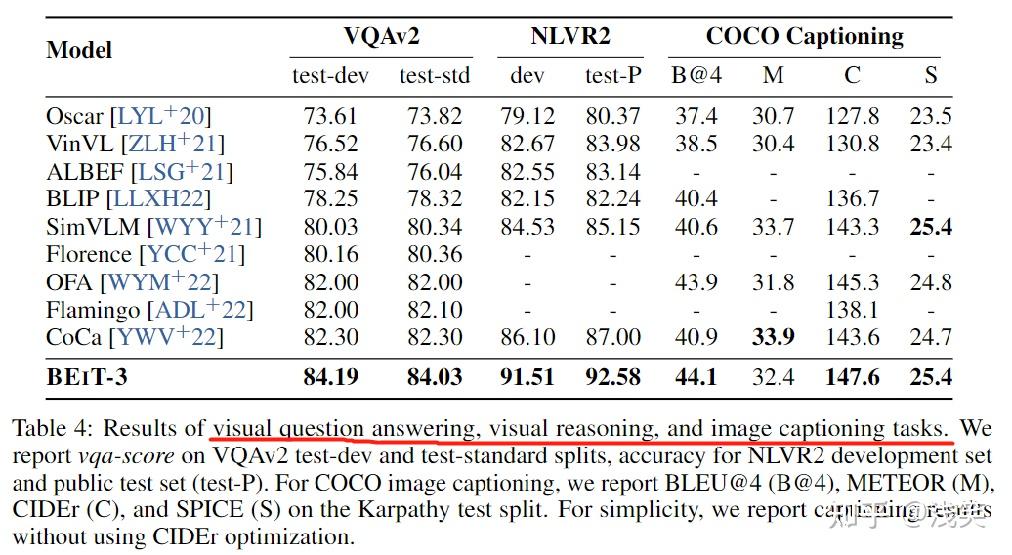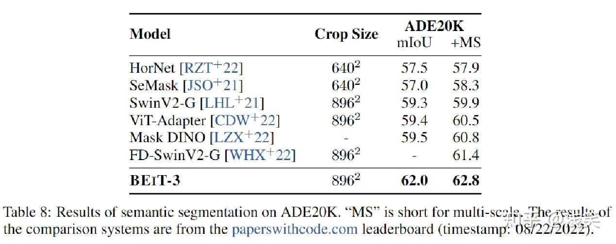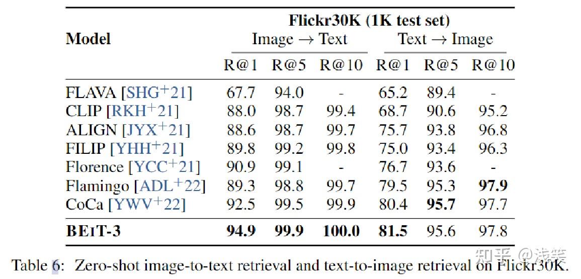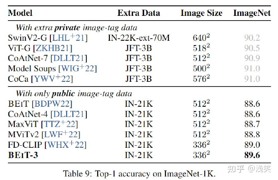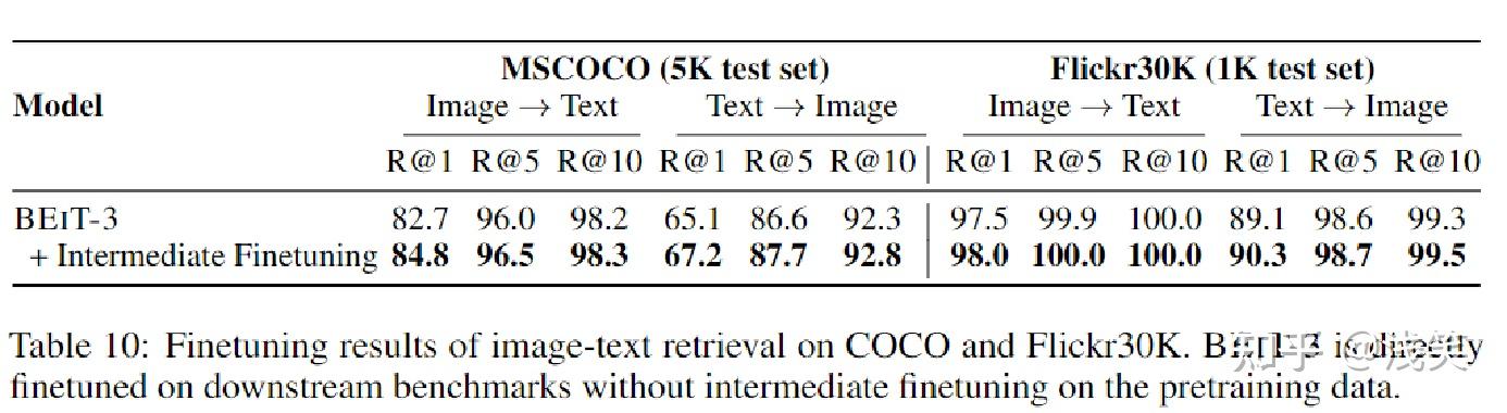 ImageNet-1K包含1.28M训练图像和50k 1k类的验证图像。首先在ImageNet-21K上执行中间微调,然后在ImageNet-1K上训练模型。定义为图像到文本检索任务,使用类别名称作为文本来构建图像-文本对。BEIT-3被训练为双编码器