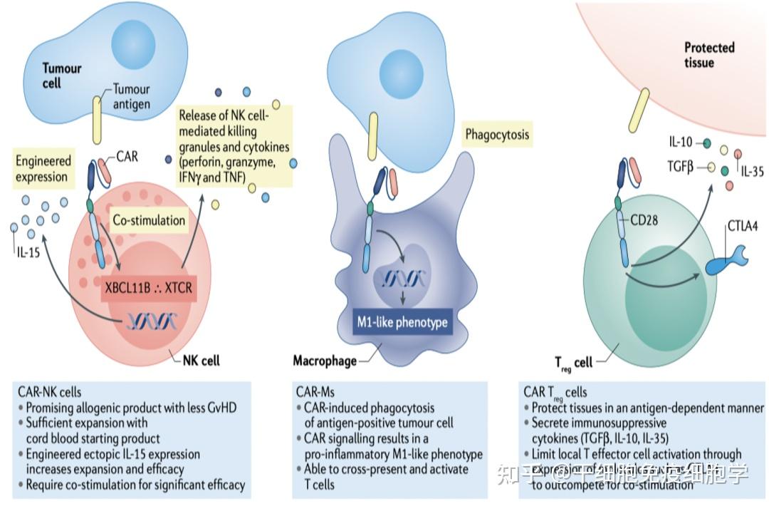 CAR-NK:NK细胞是自然杀伤细胞,具有天然的抗肿瘤作用。其优点是无MHC限制性,安全性较高,可制备同种异体细胞,CAR-NK是通用型细胞治疗一个比较好的选择。CAR-M(巨噬细胞):巨噬细胞具有抗原特异性吞噬和促炎极化作用,能交叉递呈抗原并激活T细胞。研究表明CAR-M巨噬细胞在小鼠肺癌转移模型中展示了较强的抗肿瘤活性。CAR-Treg:Treg细胞能够分泌免疫抑制分子TGFβ, IL -10, IL-35,可用于治疗自身免疫性疾病和器官移植的排斥反应,也可防止T细胞过度激活。