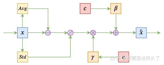 结合图(基于Conditional Layer Normalization的条件文本生成)与公式看,g,b就是 ,而c可以认为是模型的输入,即这里认为预先产生的条件, CLN就是在LN的基础上,将输入作为条件融入LN的 ,如参数中,举个例子,假设现在有个任务为看图说话,则条件为图像的embedding,w*c就是将条件输入转成与gama, beta相同的维度进行叠加, 其他的仍然是LN的正常步骤。