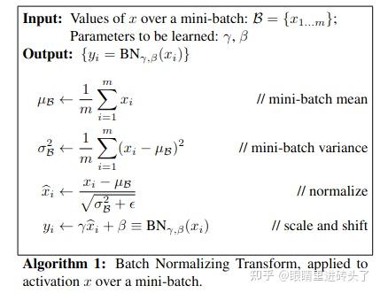其中 就是表示一个样本,一个mini-batch共有m个样本,以上是batch normalization 的公式,前三步是标准的normalization 工序, 第四步还有一个带参数的反向操作, 表示将 经过normalize 后的数据再扩展和平移。