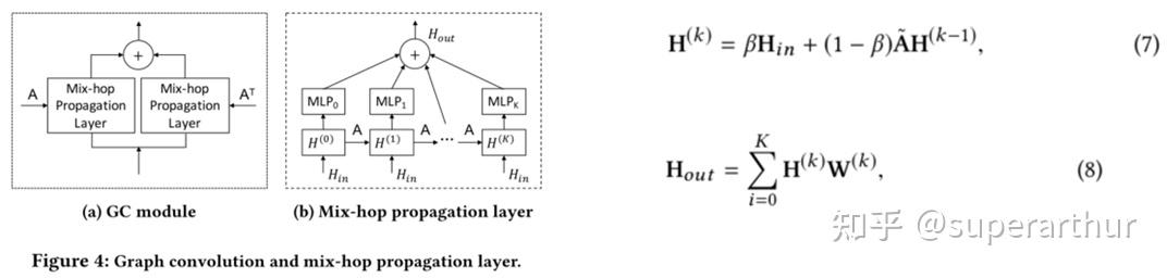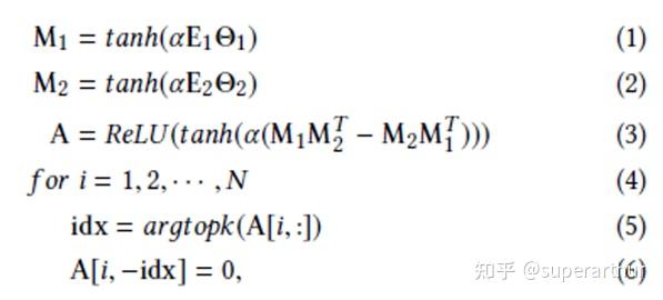 其中E_1,E_2表示随机初始化的节点嵌入,它们在训练过程中是可学习的,Θ_1,Θ_2是模型参数,α是用于控制激活函数的饱和率的超参数,而argtopk()返回向量的最大的k个索引。图形邻接矩阵的不对称性由公式3来实现。减法项和ReLU激活函数对邻接矩阵进行正则化,因此,如果A_vu为正,则其对角线对应的A_vu将为零。