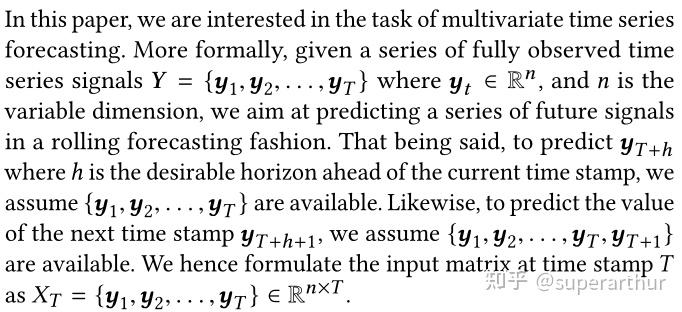 在本文中,我们专注于多元时间序列预测的任务。 令z_t∈R^N表示在时间步长t处维度为N的多元变量的值,其中z_t [i]∈R表示在时间步长t处第i个变量的值。给定对多元变量X={z_(t_1 ),z_(t_2 ),…z_(t_p )}的观察值的历史P时间步长序列,我们的目标是预测Y={z_(t_(P+Q) )}的第Q步的值, 或一系列未来值Y={z_(t_(P+1) ),z_(t_(P+2) ),…,z_(t_(P+Q) )}。