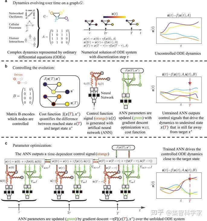 AI Pontryagin 的运行方式,之后的训练过程,可以看成随时间展开的RNN。a 使用常微分方程表示未受控制的网络动力系统的示例。b 使用ANN对网络系统进行控制的基本要素。c 使用梯度下降法训练ANN完成控制任务。