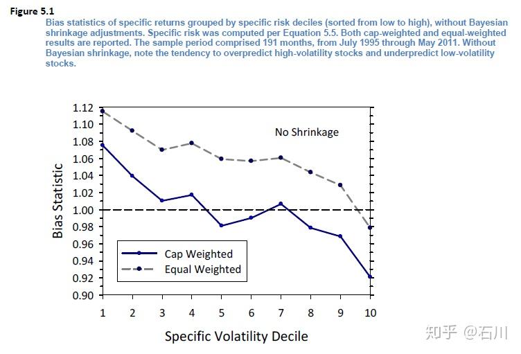 贝叶斯收缩是一个常见的将先验和样本估计值结合起来的手段;它是先验和样本估计值的线性组合(见《收益率预测的贝叶斯收缩》)。来看 Barra 的问题。首先根据实际数据计算出个股的特异性波动率。但是,Barra 指出使用样本内数据计算出的特异性波动率在样本外的持续性很差。