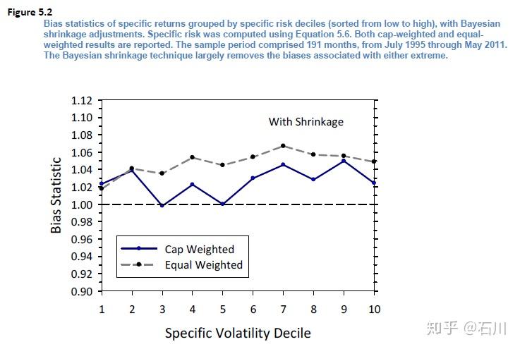 的表达式中,唯一剩下的就是要确定经验系数 q 了。Barra 没有具体说,但是不难想它一定和 Bias Statistic 有关。贝叶斯收缩的目的就是为了降低个股特异性波动率的 Bias Statistic,所以可以通过综合考虑所有个股特异性波动率收缩前后 Bias statistic 的改进来找到合适的 q 值。
