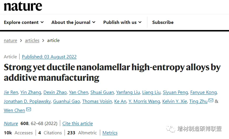美国马萨诸塞大学(麻省大学,UMASS)和乔治亚理工学院的研究人员成功3D打印了一种双相纳米结构的高熵合金,其强度和延展性超过了其他最先进的增材制造材料。这一突破可能会为航空航天、医学、能源和运输领域的应用带来更高性能的组件。相关研究成果以 'Strong yet ductile nanolamellar high-entropy alloys by additive manufacturing 增材制造的强韧纳米片状高熵合金'为题发表在世界顶级期刊《Nature》上。