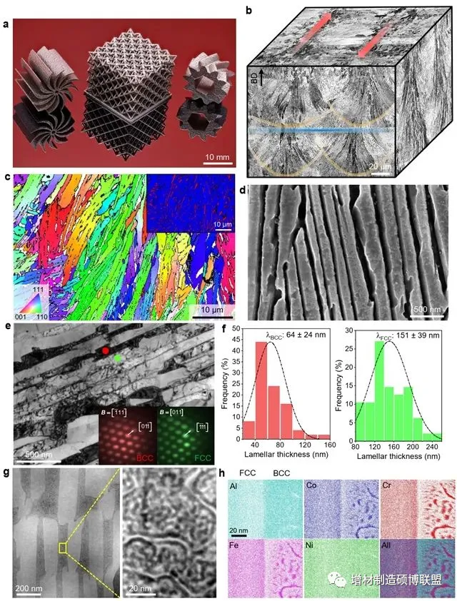 该研究揭示了利用激光3D打印特有的热物理场特性及高熵合金的多主原特性设计高性能双相/多相,异质纳米结构的思路。纳米片层组织特有的强韧化机理可有效指导高性能铝合金及钛合金多相片层结构设计。