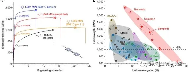 佐治亚理工学院朱的团队领导了这项研究的计算建模,开发了双相晶体塑性计算模型,以了解FCC和BCC纳米薄片所起的机械作用,以及它们如何协同工作以增加材料的强度和延展性。朱说:“我们的模拟结果显示了,BCC纳米薄片中令人惊讶的高强度和高硬化响应,这对于我们的合金可以实现出色的强度,以及延展性至关重要。这种具有卓越机械性能的3D打印,为HEA的未来发展提供了重要基础。”
