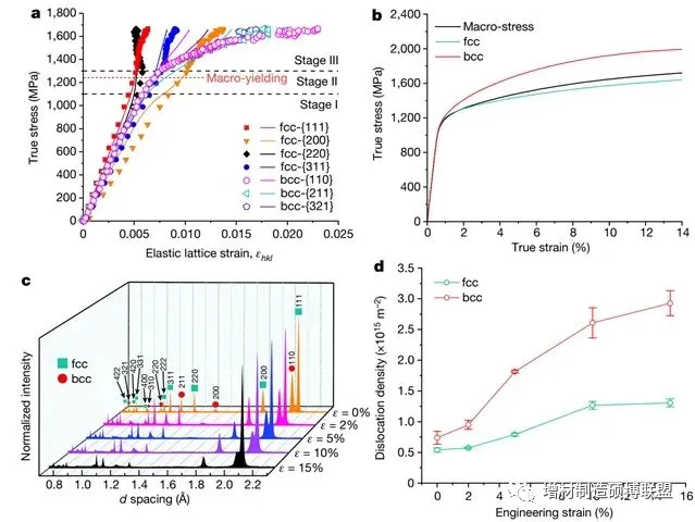 图3 通过原位中子衍射研究AM AlCoCrFeNi2.1的变形机理。(a)拉伸方向FCC和BCC特征晶面的晶格应变(lattice strain)随真应力的演变,图中标志和实线分别代表中子衍射实验和晶体塑性有限元模拟结果。(b)拉伸过程中应力在FCC和BCC相中的实时分布。(c)不同应变下合金的中子衍射图谱。(d)通过改进Williamson-Hall方法计算得到的FCC和BCC相位错密度随应变的变化。