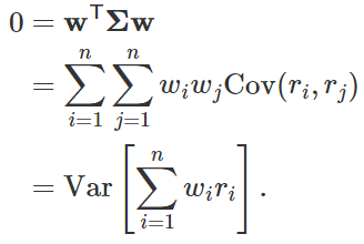 那么,按照 w1,…,wn 的比例配置 (r1,…,rn),会得到一个零方差的随机变量,对应着一个无风险的投资组合。这种情况可以在下一篇的有无风险资产的 MPT 模型中解决;本篇中不妨假设无风险资产不能由风险资产配置得来,这样 Σ 必定是可逆的。