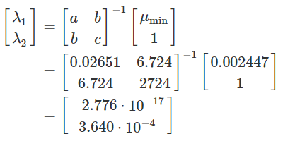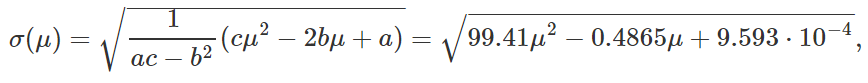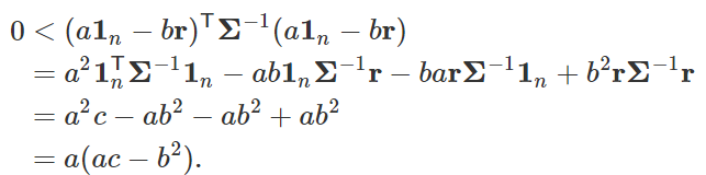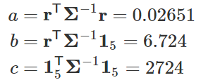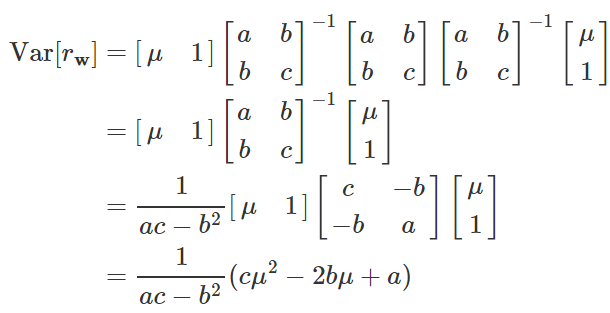 由于 σ(μ)>0,那么上面等式成立当且仅当 cμ=b,也就是说最小的标准差存对应着收益期望 μ=b/c,将这个数代进马科维兹优化问题就可以算出最小方差组合的权重了。