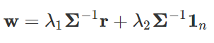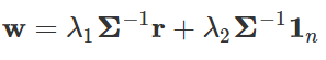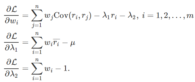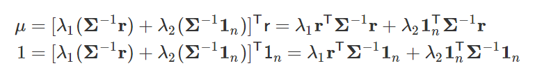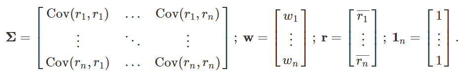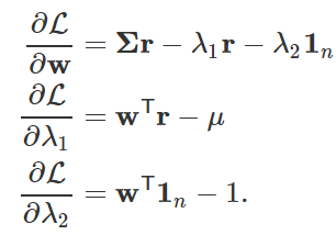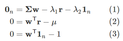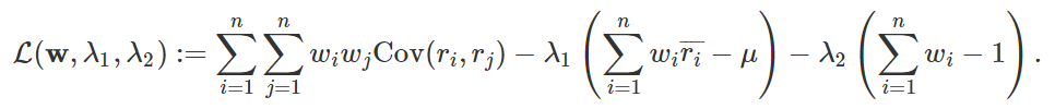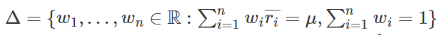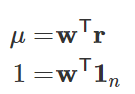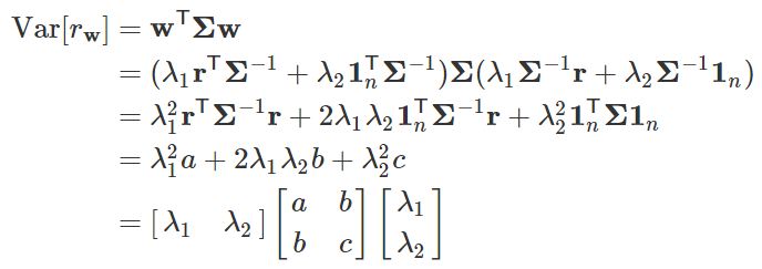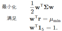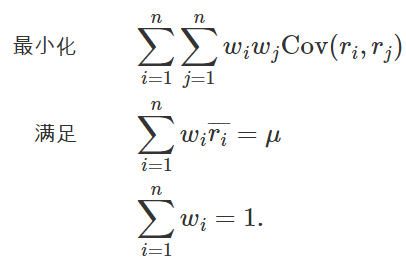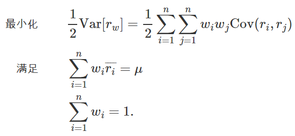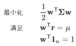 根据分散风险的方针,资产配置的一个目标是在固定预期收益的前提条件下把收益率的方差最小化,也就是对于一个固定的期望收益 μ 解决下面的最小化问题