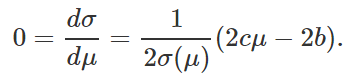 下面我们计算有效前沿上风险最小的组合。为了寻找函数 σ(μ) 的极小点,我们取其导数并将导数设为 0,