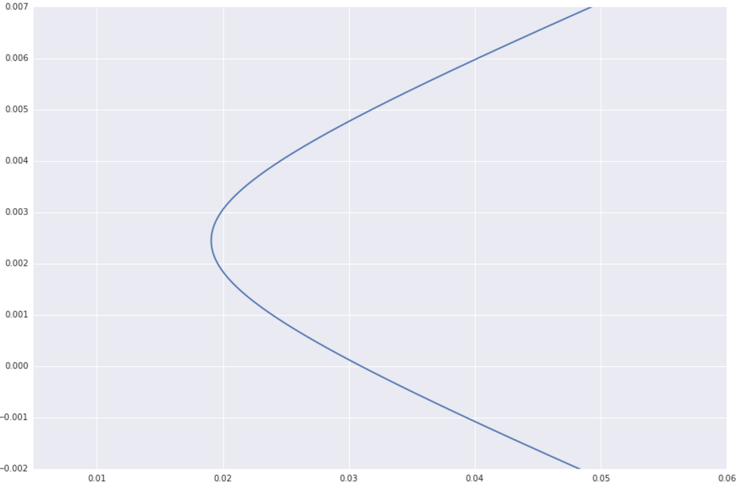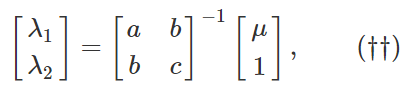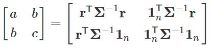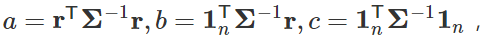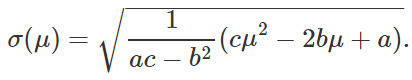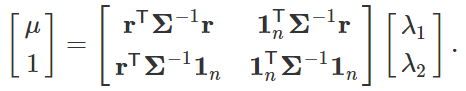 在马科维兹优化问题中,给定每一个期望收益率 μ 都有一个对应的最小标准差 σ(μ),所有这些 (μ,σ(μ)) 的二元组构成了一条曲线,叫做有效前沿。接下来我们将计算出这条曲线的公式。