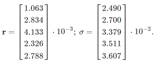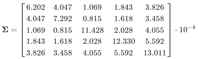 并且,我们计算这五支股票收益率的协方差矩阵为