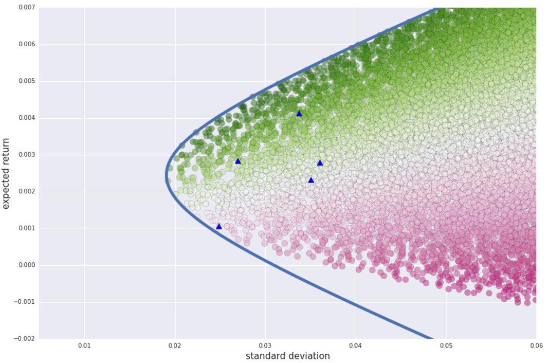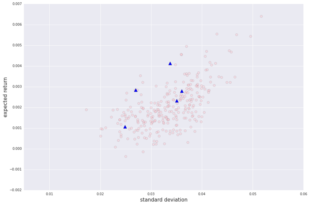 同时,我们也可以通过穷举列出一些加和为 1 的权重向量,让后计算按照这些权重配置出的资产组合的标准差和收益预期,并将这些数据也画在坐标图上,得到下面的图。图中的蓝线是之前算出的有效前沿,圆圈是穷举出的组合,五个蓝色三角形对应的是五个原生股票。