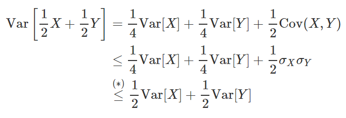 在解题之前我们确认这个规划问题的极小点是存在的。首先,目标函数(也就是方差)是一个凸函数:对于任何两个随机变量 X 和 Y 有