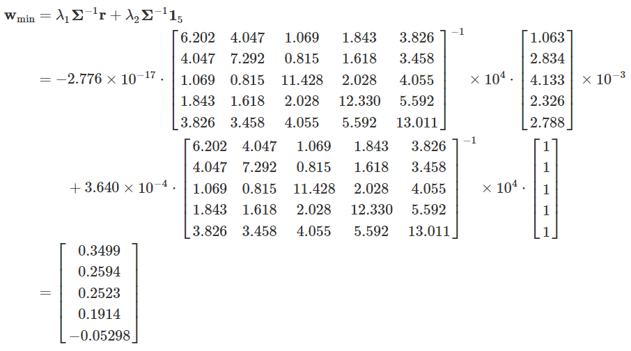 这个向量代表着五支股票配置的权重比例,其中第五支股票的权重是负数,说明需要做空。