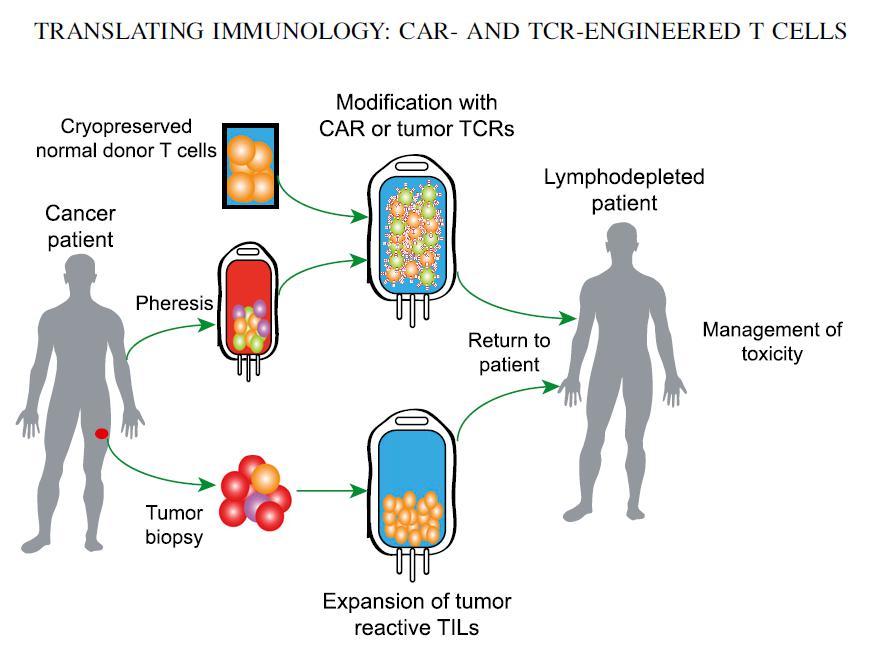 图1:目前细胞治疗的几种途径。通过修饰,使正常供体细胞的同种异体排异反应失活,同时使用抗肿瘤的CAR或TCR武装它;或利用抗肿瘤分子武装患者自体细胞。在实体肿瘤中,活检标本可用来分离TILs并进行扩增。大多数情况下,病人在接受抗肿瘤淋巴细胞输注前需要接受必要的预处理,并须谨慎处置治疗引发的毒性。