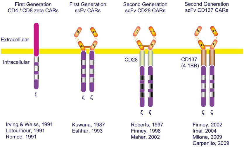 图2:CAR-T细胞的设计。第一代CAR引入了CD3ζ链或类似的信号域。基于抗体再定向的T细胞首先由Kuwana设计并由Eshhar完善。Roberts和Finney首先设计了整合CD28或CD137信号域的第二代CARs。