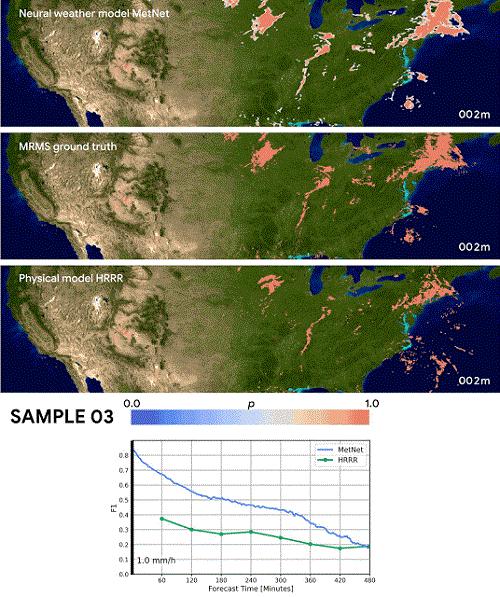 研究人员根据一个降水率预测基准对 MetNet 进行评估,并将结果与两个基线进行比较:NOAA 高分辨率快速刷新 HRRR 系统,这是目前在美国运行的物理天气预测模型。