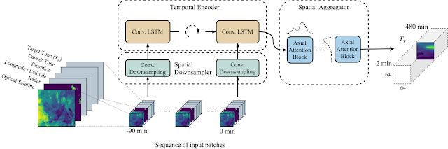 由于以全分辨率处理 1024km*1024km 的区域需要大量内存,因此研究人员使用空间下采样器,通过减少输入面片的空间维度来减少内存消耗。同时,在输入中查找并保留相关的天气模式。然后沿降采样输入数据的时间维度应用时间编码器,对 90 分钟输入数据的 7 个快照进行编码,编码片段长度为 15 分钟。时间编码器采用卷积 LSTM 实现,该卷积 LSTM 特别适合于图像序列。接着,时间编码器的输出被传递到空间聚集器,空间聚集器使用轴向自关注,有效地捕获数据中的长距离空间依赖性,并基于输入目标时间使用可变数量的上下文,以在 64km*64km 的输出上进行预测。这种结构的输出是一个离散的概率分布,估计美国大陆每平方公里的给定降水率的概率。