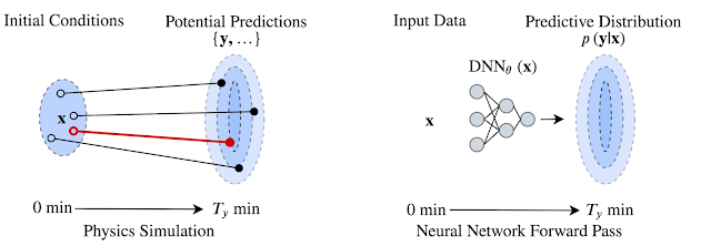 HRRR(左)从许多可能的结果中预测单个潜在的未来结果(红色),而 MetNet(右)通过分配未来结果的概率直接解释不确定性。