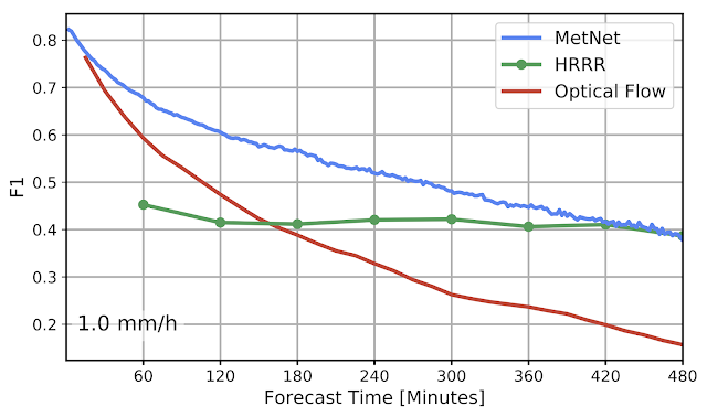 在下面的图表中,研究人员量化了MetNet、HRRR 和光流基线模型之间的性能差异。这里展示了这三个模型所取得的性能,在降水率阈值为 1.0mm/h(相当于小雨)时使用 F1 分数进行评估。MetNet 神经天气模型能够在 8 小时内超过 NOAA-HRRR 系统,并且始终优于基于流量的模型。