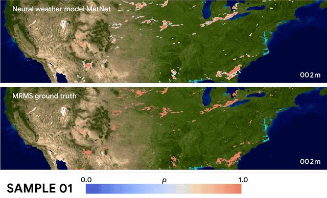网络的输入来自雷达站和卫星网络,无需人工标注。模型输出是一个概率分布,Google 用它来推断每个地理区域的降水率和相关的不确定性。下图提供了该网络对美国大陆的预测示例。