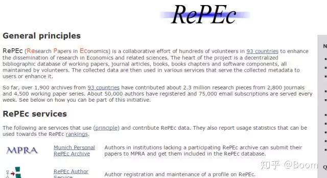 RePEc主要搜集了与经济学相关的预印本论文,它提供的期刊杂志及研究论文都是免费的,包括100多种经济期刊、研究报告、软件等。