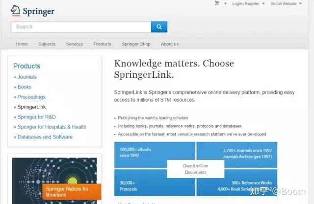 德国施普林格(Springer-Verlag)是世界上著名的科技出版集团,它的系统提供学术期刊及电子图书的在线服务。2002年7月开始,Springer公司和EBSCO/Metapress公司在国内开通了SpringerLink服务。