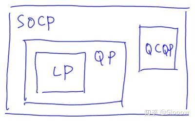 例子 1:半正定规划之所以重要,是因为他的形式更广泛,前面说 SOCP 包含了 LP、QP、QCQP,而半正定规划则包含了 SOCP!比如下面的 SOCP 问题就可以转化为 SDP