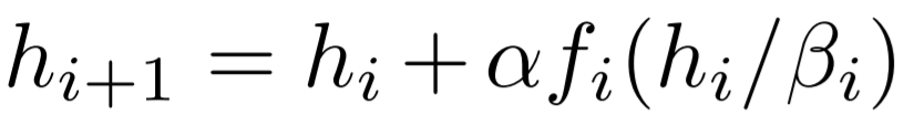 其中,h_i 代表第 i 个残差块的输入,f_i 代表由第 i 个残差分支计算的函数。