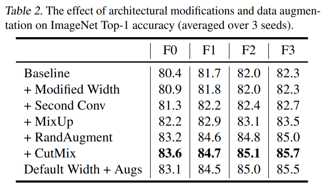 该研究通过手动搜索设计导向来探索模型设计的空间,这些导向对比设备上的实际训练延迟,可带来 ImageNet 上 holdout top-1 的帕累托前沿面的改进。它们对 holdout 准确率的影响如下表 2 所示:
