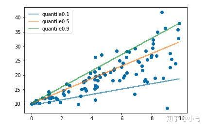 分位数回归Quantile Regression是一类在实际应用中非常有用的回归算法,通常的回归算法是拟合目标值的期望(MSE)或者中位数(MAE),而分位数回归可以通过给定不同的分位点,拟合目标值的不同分位数。例如我们可以分别拟合出多个分位点,得到一个置信区间,如下图所示: