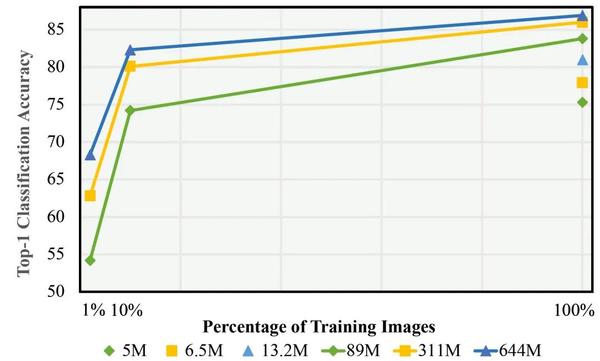 此外,我们还探索了大规模ViTAE模型的少样本学习能力。我们分别使用1%,10%,和100%的数据对大规模ViTAE模型进行了微调。结果如图2所示,仅仅使用10%的数据进行训练,ViTAE-H模型的分类准确度达到了82.4%,超过了小规模模型ViTAE-13M使用100%数据进行全监督训练的准确度(81.0%)。这说明了大规模模型具有很强的少样本学习能力。