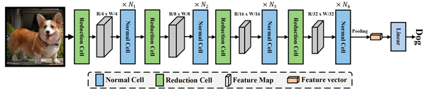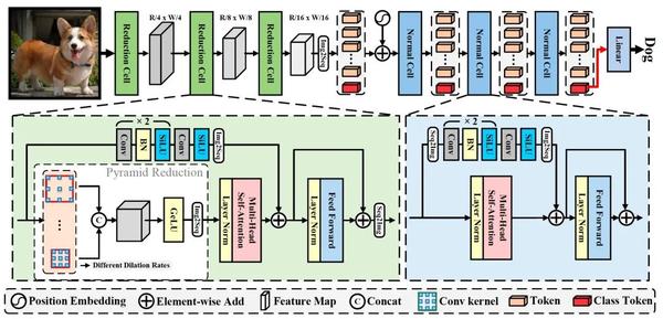 Vision Transformer模型通过使用attention对划分成小块的图像进行建模,得到了很好的效果。在ViTAE[2]中,我们从模型设计的角度在transformer中引入了归纳偏置,并提出两种新的基础模块,即reduction cell (RC)和normal cell (NC), 如图1所示。Reduction cell使用多尺度卷积来为transformer模型引入尺度不变性。Normal cell使用并行的卷积分支,在不影响transformer全局建模能力的情况下引入局部归纳偏置。通过引入这样的两种机制,ViTAE模型取得了较好的数据效率和分类准确度。