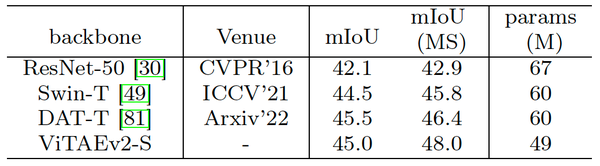 表6 ViTAEv2 在语义分割数据集ADE20k上的效果比较