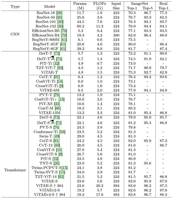 我们所提出的大规模ViTAE模型的效果如表1所示,引入归纳偏置的ViTAE-B模型相对于不包含归纳偏置的ViT-B模型有0.4%分类准确度的提升。类似的,对于更大尺寸的模型,例如ViTAE-L(311M),引入归纳偏置仍然可以带来0.3%分类准确度的提升。如果使用ImageNet数据集本身提供的22k版本进行微调,大规模的ViTAE模型还可以有1.0%左右准确的提升。此外,仅仅使用ImageNet-1K数据集进行训练时,我们所提出的ViTAE-H(644M)模型在ImageNet-Real数据集上达到了91.2%的分类准确度,超过了使用额外数据进行训练的3B规模的ViT-G[6]模型,在目前已知方法中排名世界第一。[https://paperswithcode.com/sota/image-classification-on-imagenet-real]